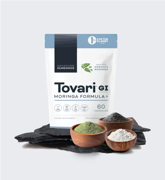 Tovari GI combines a standardized, cold-prep organic Moringa with a proprietary humic and fulvic acid complex plus l-glutamine to support the gastrointestinal ecosystem.†