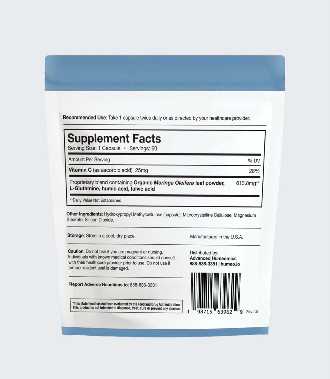 Proprietary blend containing: Organic Moringa Oleifera leaf powder (450 mg), l-glutamine (100mg), Humic and Fulvic Acid Complex (62mg), Ascorbic Acid (25mg)